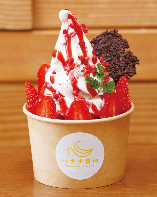 風味豊かなバナナソフトクリームと角切りバナナに、いちごソース、ドライストロベリー、フレッシュいちごを盛り付け、サクサク食感のビターチョコクランチをトッピングした、バナナといちごの贅沢パフェ。※数量限定