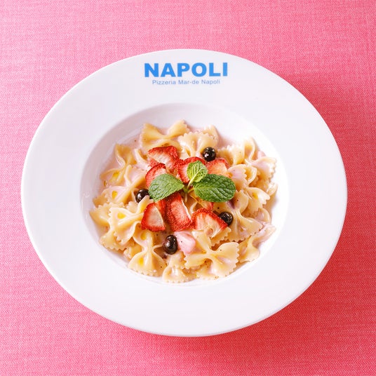 リボンの形をしたパスタに、いちごとブルーベリーを生クリームでほんのり甘く和えました。いちごはフレッシュとドライの2種類を使用しています。