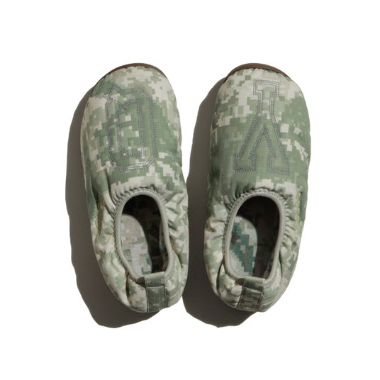 もう1型は歩行性をアップデートさせたオリジナルインソール「HEXMAX」が採用された、カカト付きのSUBUの最新モデル「VAMP」を採用し、世界地図をデジタルカモに落とし込んだ柄をメインに、アッパー部分にYouthQuakeの頭文字であるYQをリフレクター素材の糸を使用し大胆に刺繍したデザインとなっている。シューズを購入した方にはSUBUの収納は勿論、日常で使える特製ヘルメットバッグも展開。どちらも価格は¥13,000-税込