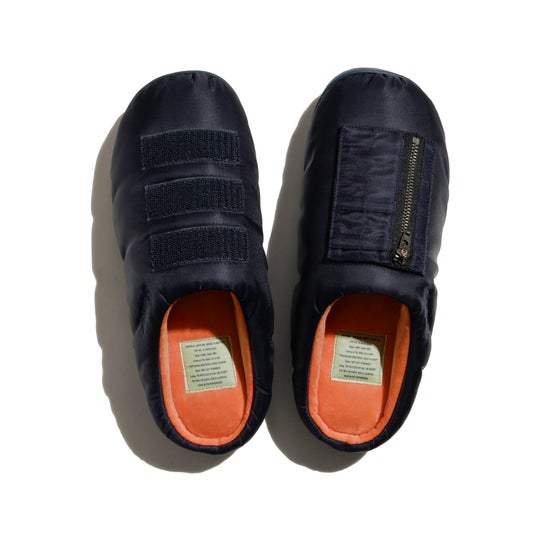 今回は2型のモデルを展開しており、SUBUの定番モデル「ORIGINALS F-LINE」をベースに、ミリタリーウェアのMA-1より着想を得たモデルは、アッパー部分にはワッペンが着脱可能なディテールが入っており、YouthQuakeデザインのワッペンが3種類付属。