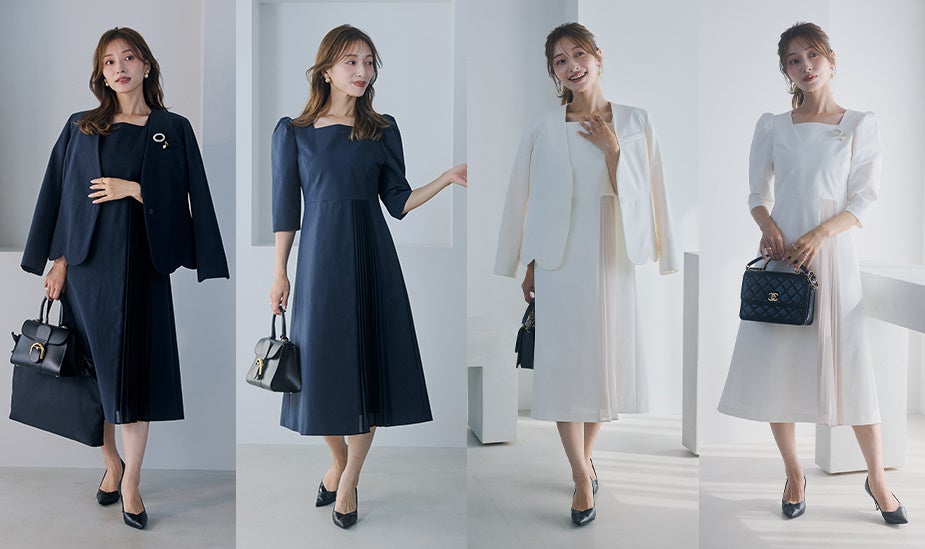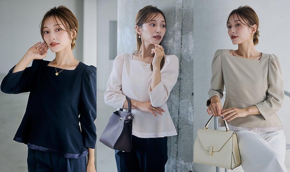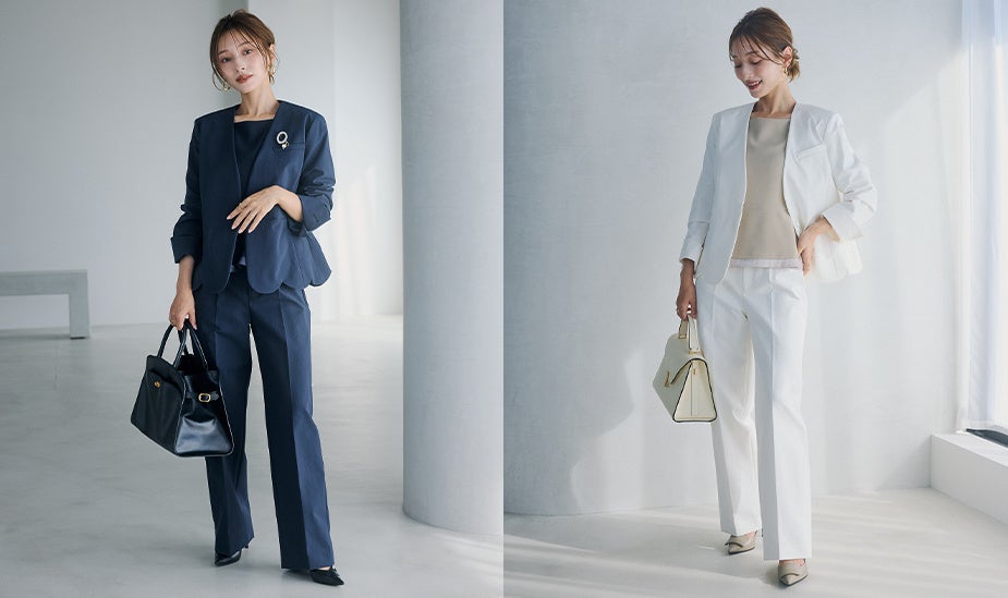 今回は、「ハンサムスカラップジャケット」「ハレ映えプリーツワンピース」「きれい見えセミワイドパンツ」「華やぎペプラムブラウス」。サブアイテムとして欠かせないトートバッグやブローチも揃います。