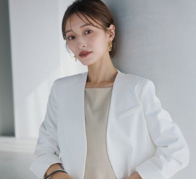 すっきりとしたノーカラーに、理紗さんこだわりの大き目のスカラップを裾にあしらったジャケットは凛とした印象の中にやわらかな華やぎを添える一枚。