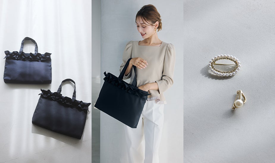 トートバッグはとネイビーとブラックの2色展開。パールがつややかなブローチもハレの日のマストアイテム。