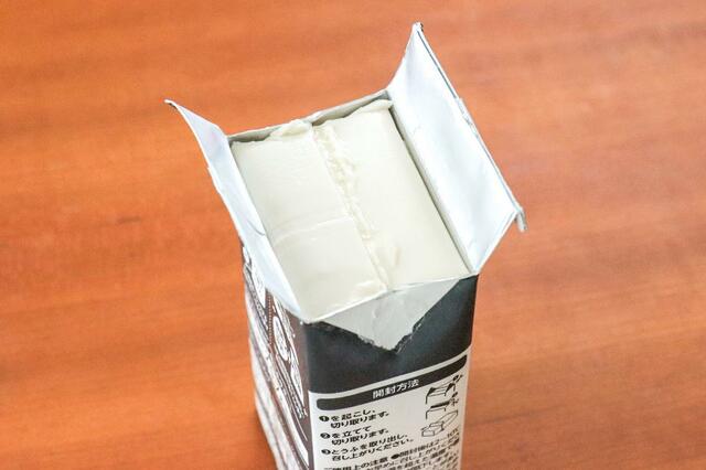 紙パックの上部分をハサミでカットして、中身を出します。