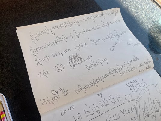 世界に一冊だけの「世界の架け橋ノート」--左頁は遊佐、右頁はカンボジア