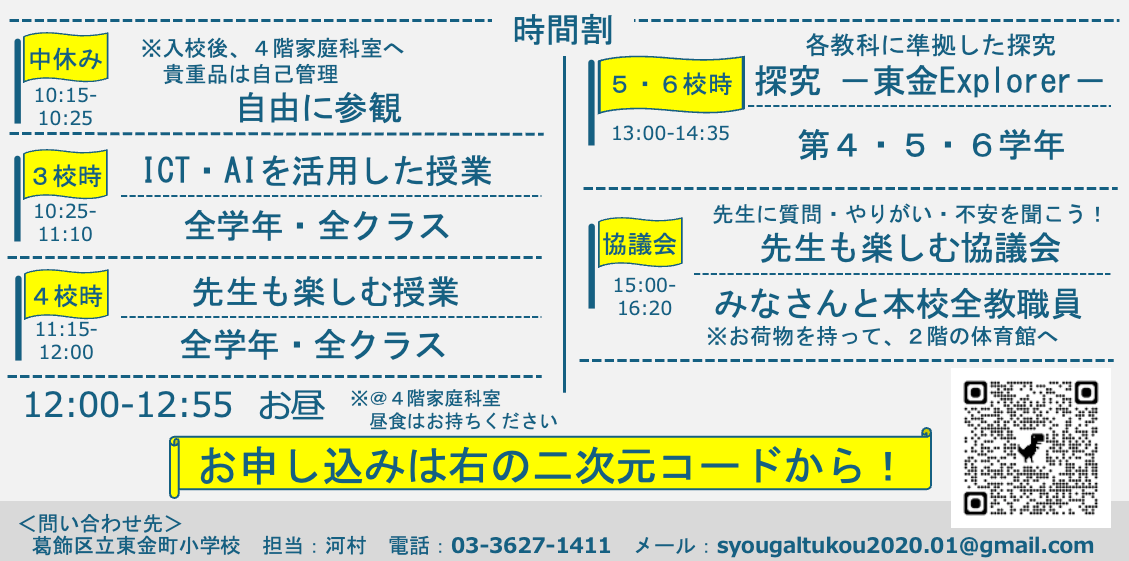 本学校公開は「教員の魅力を伝えたい!」「今の教育現場を学生の頃に見たら何か変わるかも?!」「(あわよくば)教員のなり手を少しでも増やしたい!」という先生たちの考えから、昨年度に引き続き、開催することとなりました。本学校公開に参加したから必ず教師にならなければいけないというわけではありませんので、安心してください。「子どもたちが楽しんでいる姿」「ICTを活用して学んでいる子どもたちの姿」「楽しんで授業している教師の姿」など見てもらえれば幸いです。