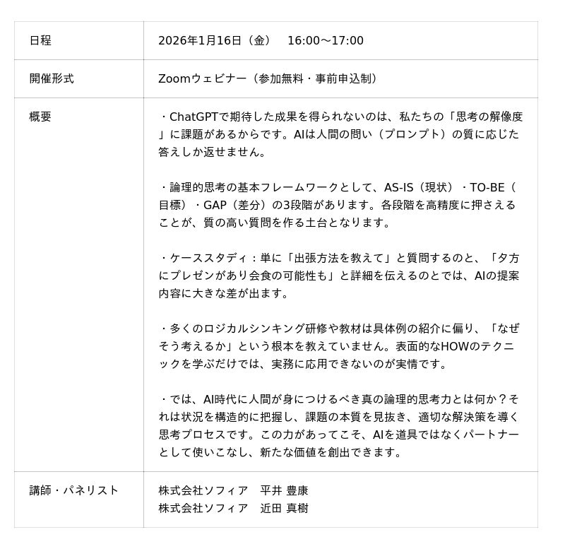 本セミナーでは、AI時代に求められる論理的思考力を鍛える具体的な方法をお伝えします。AS-IS/TO-BE/GAPといった思考フレームワークを再確認し、それをChatGPTなど生成AIへの適切な指示(プロンプト)作成に応用する手法を解説。単なる事例集ではなく、現場で使える思考の解像度の上げ方に焦点を当てた内容です。実例を交えながら、AIをビジネスパートナーとして活用するヒントを探ります。