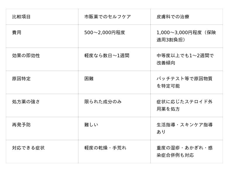本調査では市販薬使用者の67.3%が改善を実感できておらず、多くの方が適切な治療を受けられていない実態が明らかになりました。ひび割れからの出血、強いかゆみ、水疱の発生などがある場合は手湿疹や接触皮膚炎の可能性があり、皮膚科での専門的な診断・治療が必要です。保険適用で1,000~3,000円程度で受診できます。