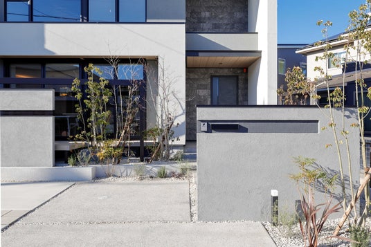 建物と外構を一体設計しトーンを統一。上質な素材使いと美しい水平ラインが魅力的なファサードアプローチが、日々の帰宅を特別な瞬間に