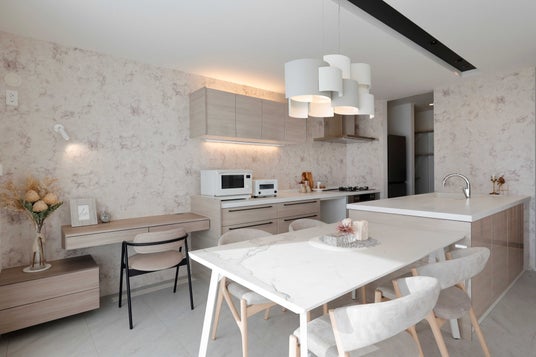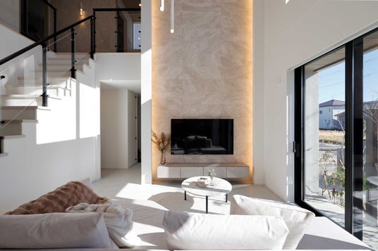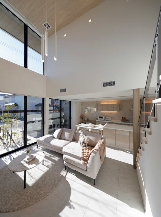 吹抜けがもたらす圧倒的な大空間とここちよさを両立した「まるごと外断熱×全館空調」だから叶う理想の住まい。グレージュを基調とした落ち着いた空間に、厳選した家具・小物をコーディネートし洗練された高級感を演出