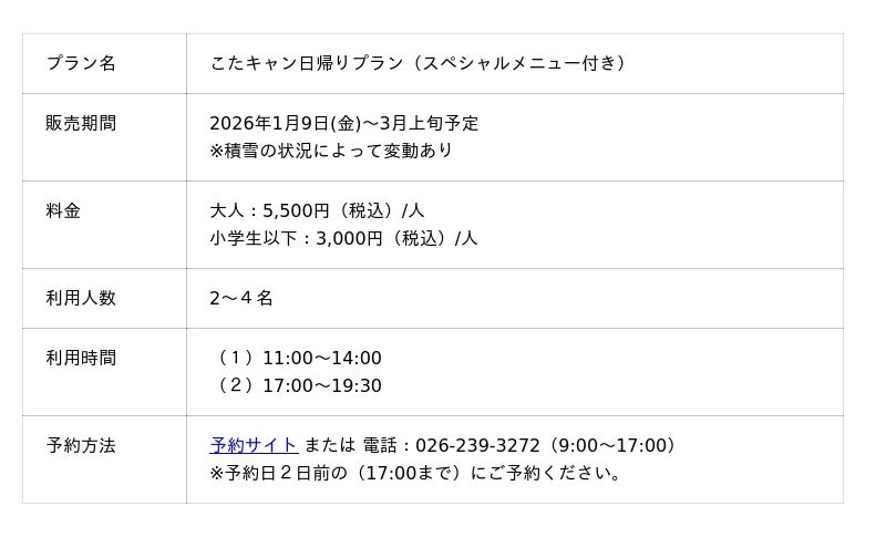 nagano forest village (所在地:長野県長野市、運営:eternal story株式会社 )は、2026年1月9日(金)から3月上旬まで冬ならではの体験プラン「こたキャン」を販売いたします。