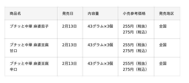 「プチッと中華」シリーズは、中華料理を人数に合わせて手軽に作ることができる“1個で1人分の中華調味料”です。2025年2月に発売した「回鍋肉」「青椒肉絲」「麻婆豆腐 中辛」の3アイテムは、利便性の高さからご好評をいただいております。このたび、よりさまざまな中華料理を1人分から手軽に楽しんでいただくことを目指し、新たに「麻婆茄子」「麻婆豆腐 甘口」「麻婆豆腐 辛口」をラインアップに加えました。