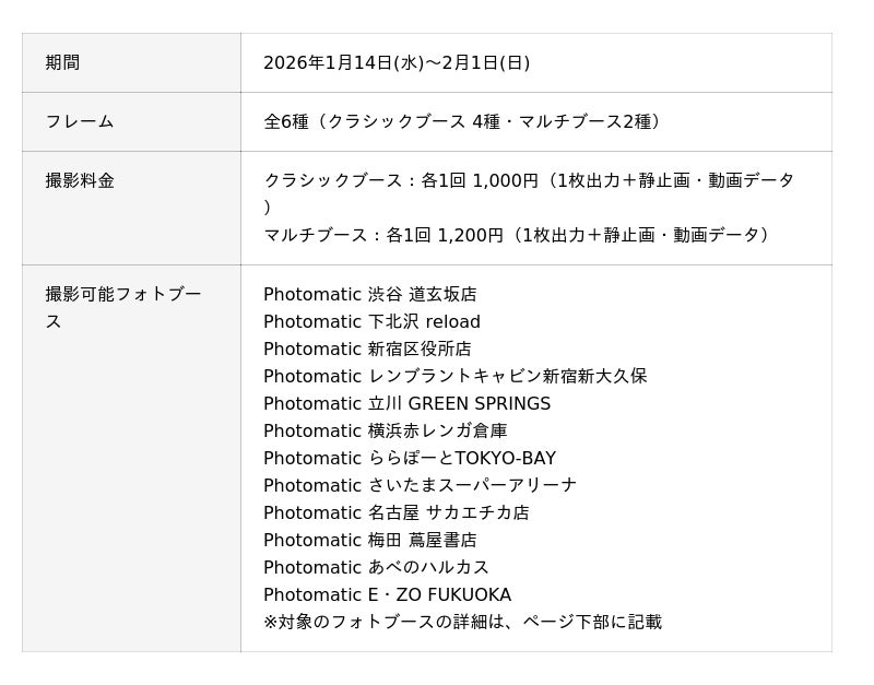 キタムラ・ホールディングス グループのピックハイブ株式会社(本社:東京都新宿区、代表取締役社長 兼 COO:大迫 由典)が運営するセルフフォトブランド「Photomatic(読み:フォトマティック)」は、2026年1月14日(水)から2月1日(日)の期間中、シンガーソングライター・山本彩氏のコラボレーションフレーム全6種を東京・大阪・名古屋をはじめとした全国12カ所のフォトブースで展開いたします。