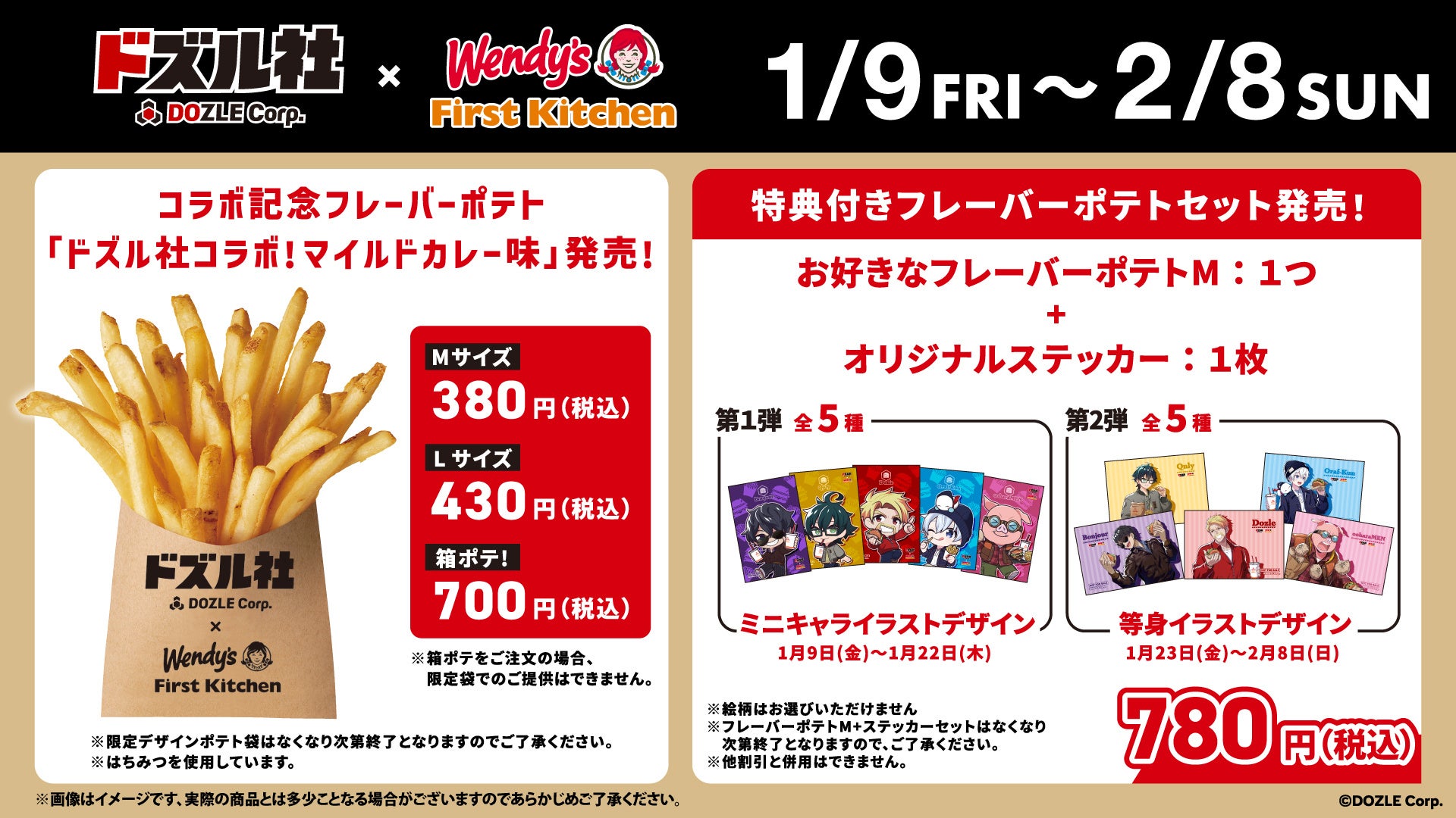 ウェンディーズ・ジャパン株式会社及び、ファーストキッチン株式会社(所在地:東京都新宿区、代表取締役:紫関修)は1月9日(金)より、ウェンディーズ・ ファーストキッチンとファーストキッチン(競馬場店を除く)で、ゲーム実況グループ『ドズル社』とのコラボキャンペーンを開催します。コラボを記念して、ドズル社をイメージした「ドズル社コラボ!マイルドカレー味」ポテトの販売、オリジナル描き下ろしイラストを使用した、「ステッカー」とお好きなフレーバーポテトMセット780円(税込)を2月8日(日)までの期間中、数量限定で販売します。数に限りがありますのでお早めにご来店ください。また、5店舗限定でコラボメニュー、コラボグッズなど盛りだくさんの内容を実施します。ぜひ『ドズル社』とのコラボレーションをお楽しみください。