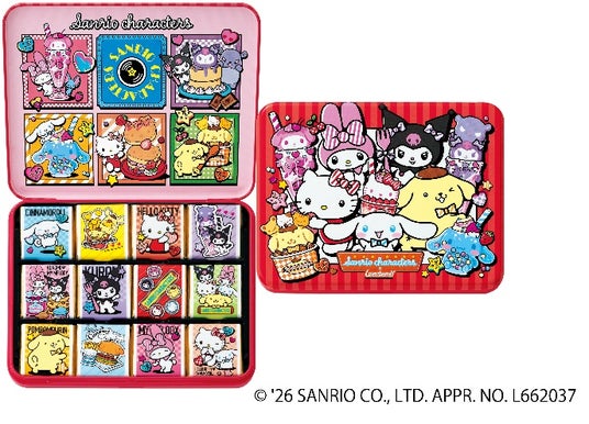 特 長:クロミ、マイメロディ、ポムポムプリン、ハローキティ、シナモロールの様々なポーズを描いた、12種類の薄板型チョコレートを、キャラクターデザイン満載の蝶番缶に詰め合わせました。