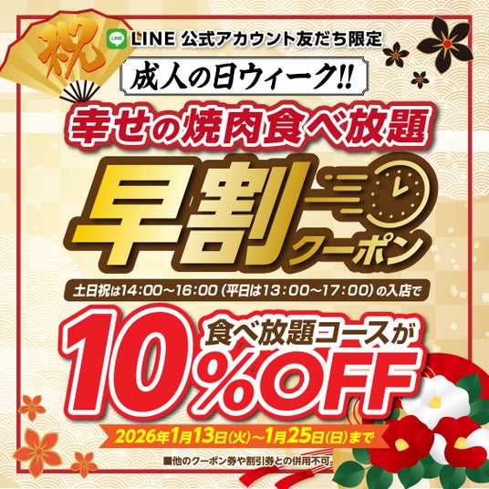 ワタミ株式会社(東京都大田区、以下ワタミ)と国内有数の和牛生産者であるカミチクグループ(鹿児島県鹿児島市)との合弁会社、ワタミカミチク株式会社(東京都大田区、以下ワタミカミチク)が展開する「かみむら牧場」は、2026年1月13日(火)から1月25日(日)までの期間中、公式LINE会員様限定で「幸せの焼肉食べ放題 早割クーポン」がご利用いただける特別企画を実施いたします。