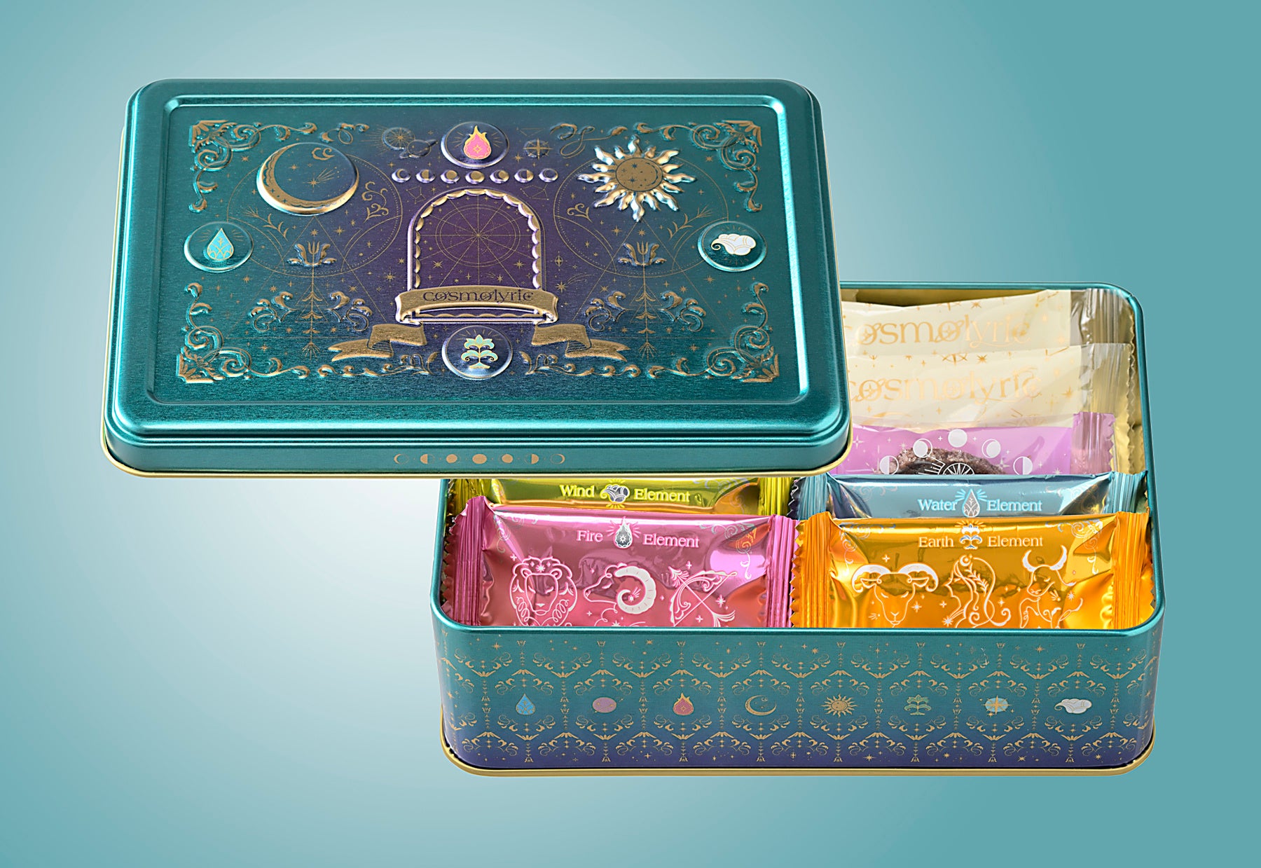 特長:エレメントと星座、月と太陽、星の軌道など、宇宙の神秘的な関係性を表した缶に、ラッキーモチーフの【月】や【星】をテーマにした焼菓子4種をアソートしました。