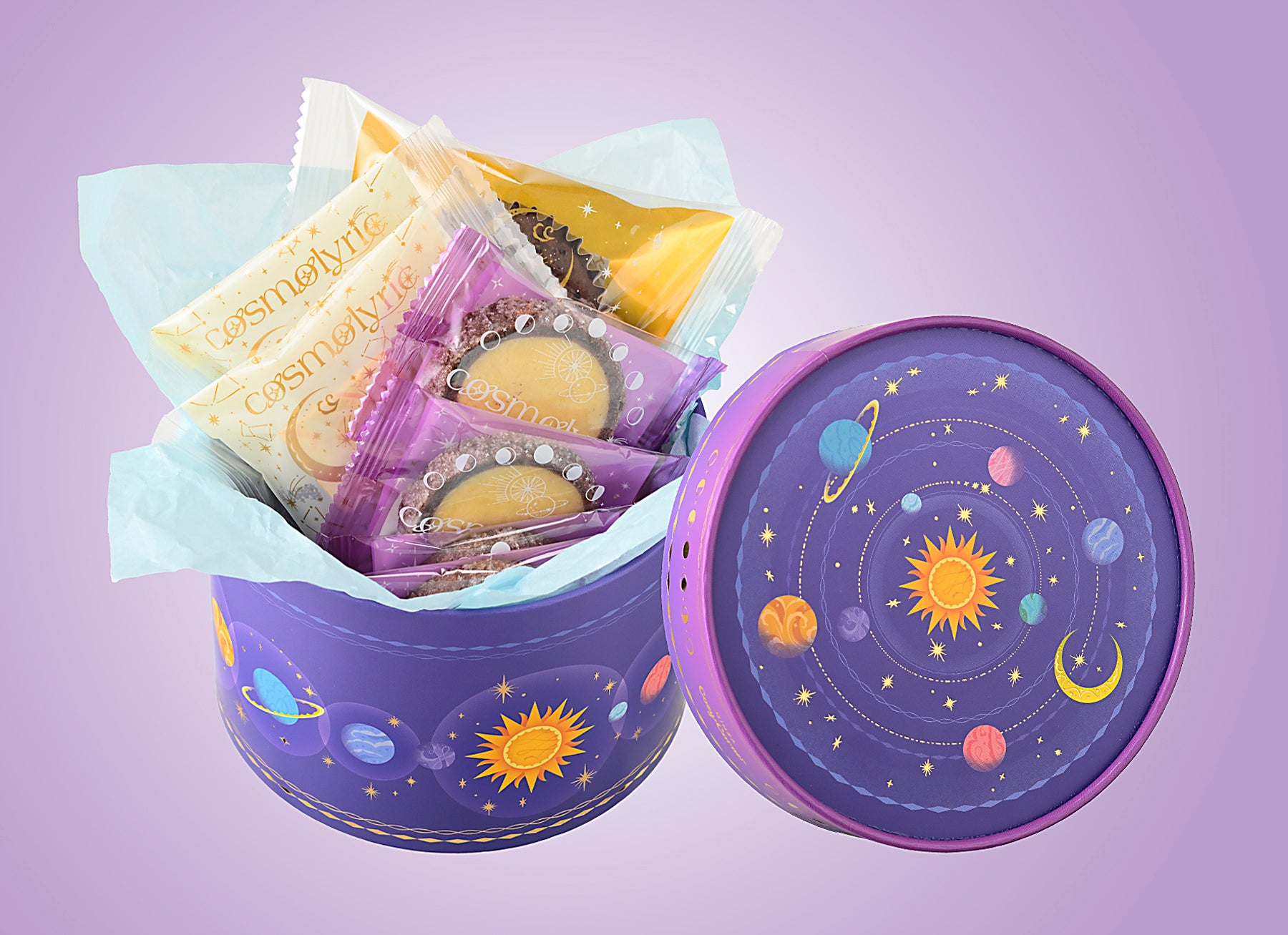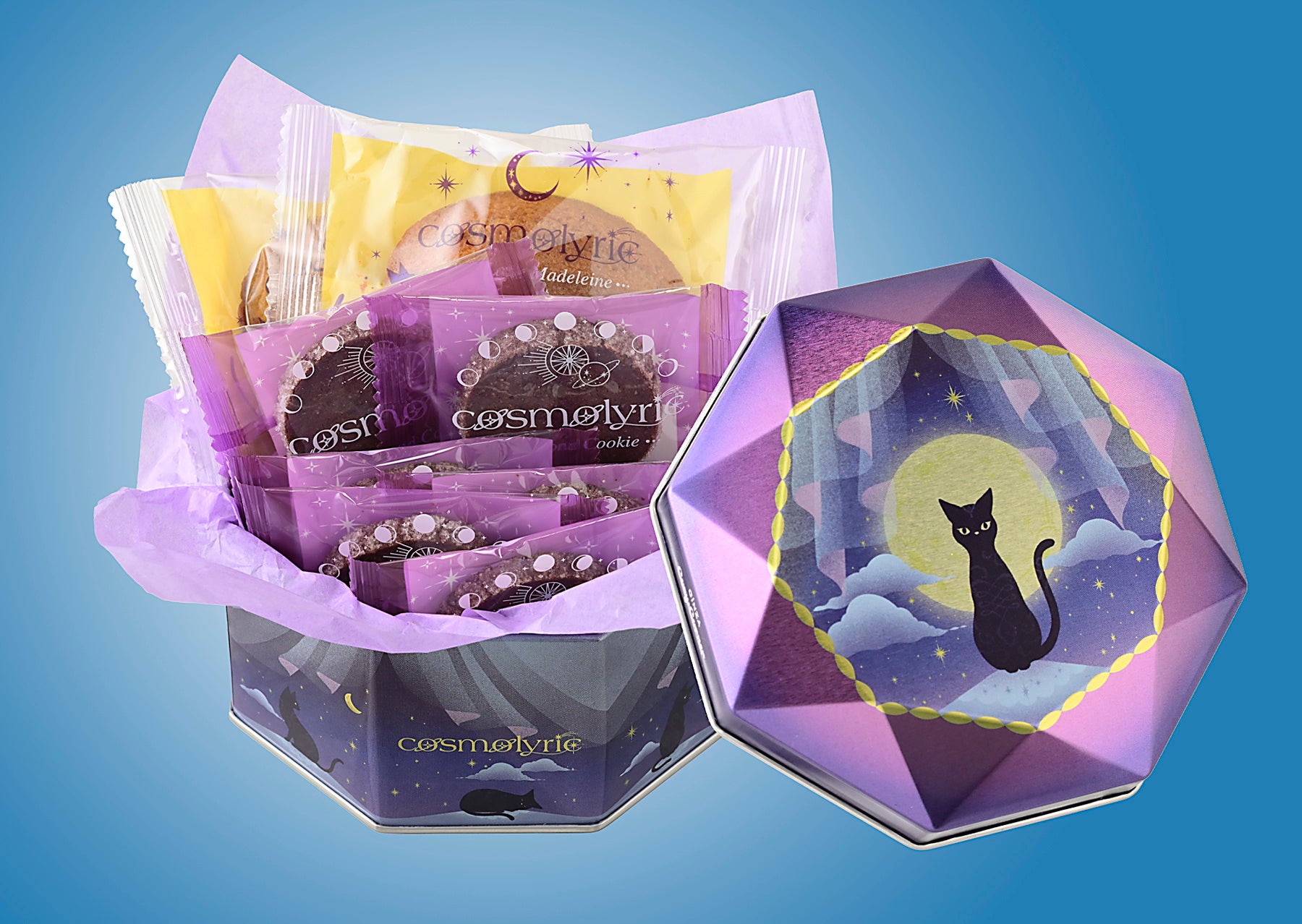 アソートの焼菓子は、月や星座などラッキーモチーフをイメージしたクッキーやマドレーヌ、パウンドケーキなど。さらに 「月と惑星BOX(7個入)」、「月影猫のミラージュ缶(8個入)」、「月とおまじない缶(10個入)」、「星ふる月夜ポーチ(8個入)」には、ポジティブになれる宇宙(ソラ)からのメッセージカードが付きます。ぜひお手に取ってお楽しみください。