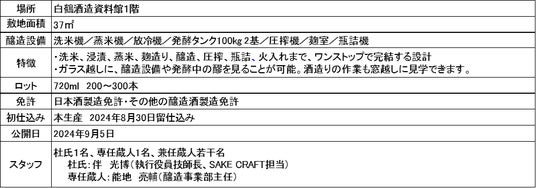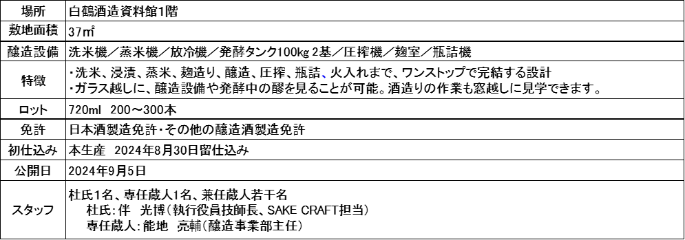 白鶴酒造資料館内に2024年9月にオープンしたマイクロブルワリーです。わずか37平方メートル の空間に、最高品質の大吟醸も造ることができる設備を導入し、洗米・浸漬・蒸米・製麹・発酵・搾り・ろ過・瓶詰めまで、酒造りの全工程を行います。来館者は、ガラス越しに醸造設備や発酵中の醪を見ることができ、スケジュールが合えば酒造りの作業も見学することができます。ここでは、杜氏と蔵人の2名が、カテゴリーにとらわれない米から生み出される新たなSAKEの可能性に挑戦していきます。完成した酒は酒造資料館でのみ販売し、同じ酒質は造らないため一期一会の出会いとなります。