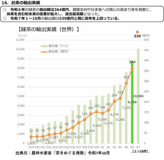 昨今、ソフトクリームのフレーバーとして、「抹茶」は非常に人気が高く、好きな味のアンケートでは、ミルクやバニラを除いたフレーバー品の中でチョコレートに次ぐ2位※1となっています。また、急増する訪日外国人観光客にとって抹茶は欠かせない人気アイテムになっていることに加え、近年は輸出も好調で、日本茶の2024年度輸出額は過去最高を記録※2しています。