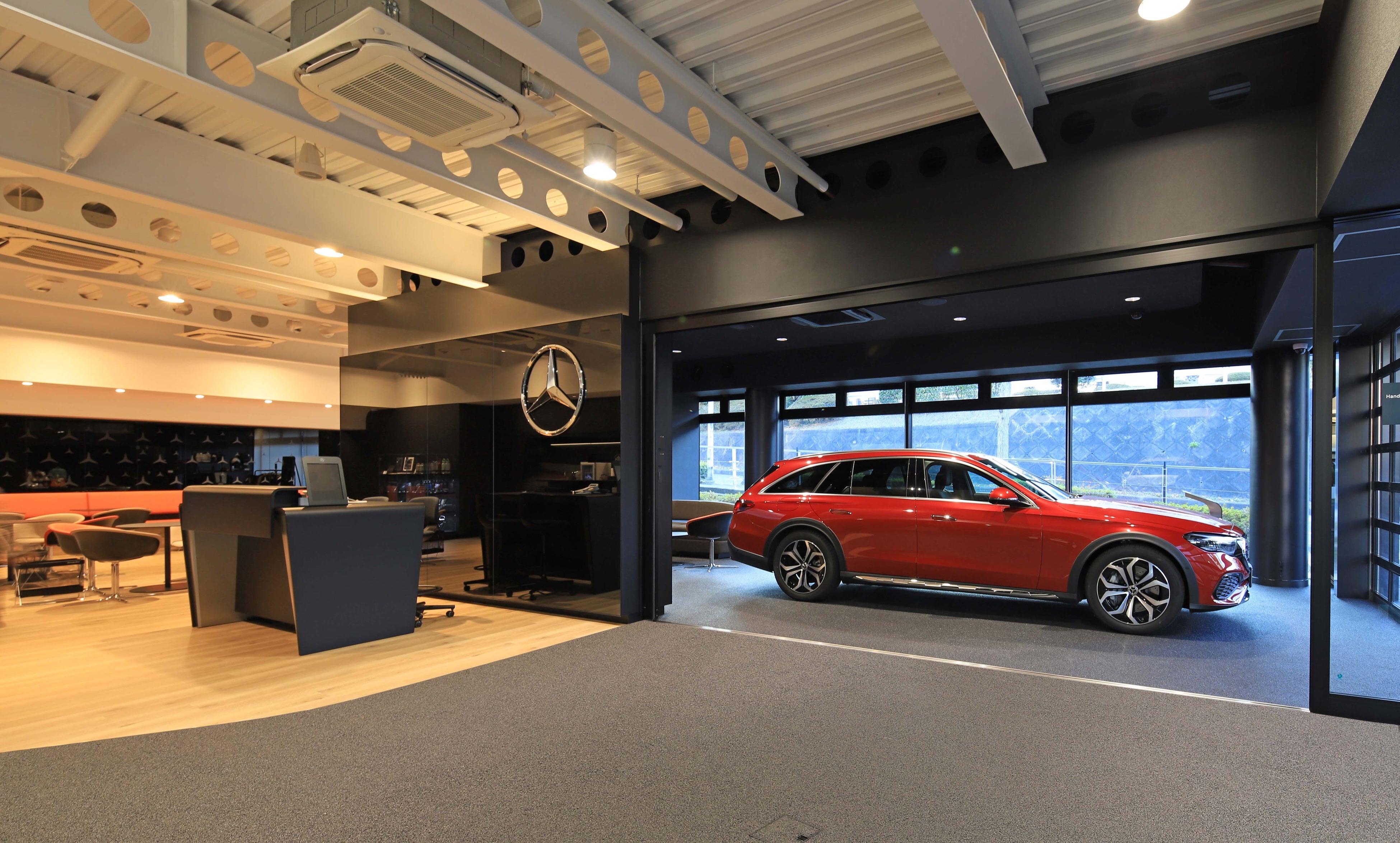 大型ビジョンを配置するなど最新設備が整ったショウルームは、新車7台を展示。納車説明を行う「ハンドオーバー」も有しています。また、14ベイと検査ラインから成るサービスワークショップは、最新の設備で整備品質を高めてお客さまの安心で快適なカーライフをサポートします。