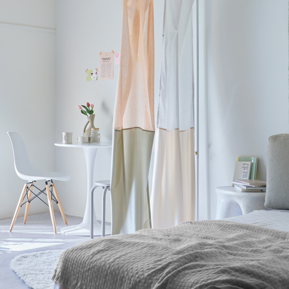 カラフルなブロックのように、色や透け感、デザインの異なるテキスタイルを自由に組み合わせ、自分だけの空間を創出。機能性とデザイン性を兼ね備えた遊び心のあるアイテムです。