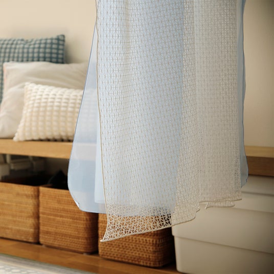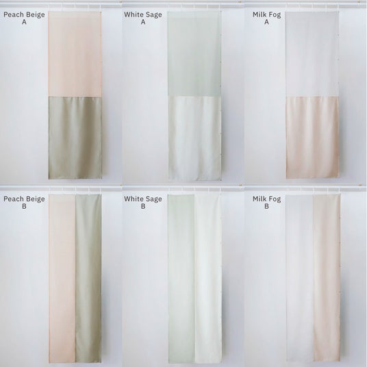 透け感をもたせながら、空間を軽やかに仕切れるカーテンです。壁をつくらず、居心地良い空間づくりに。1枚でも、ボタンでつないで好きな幅に広げても使うことができます。