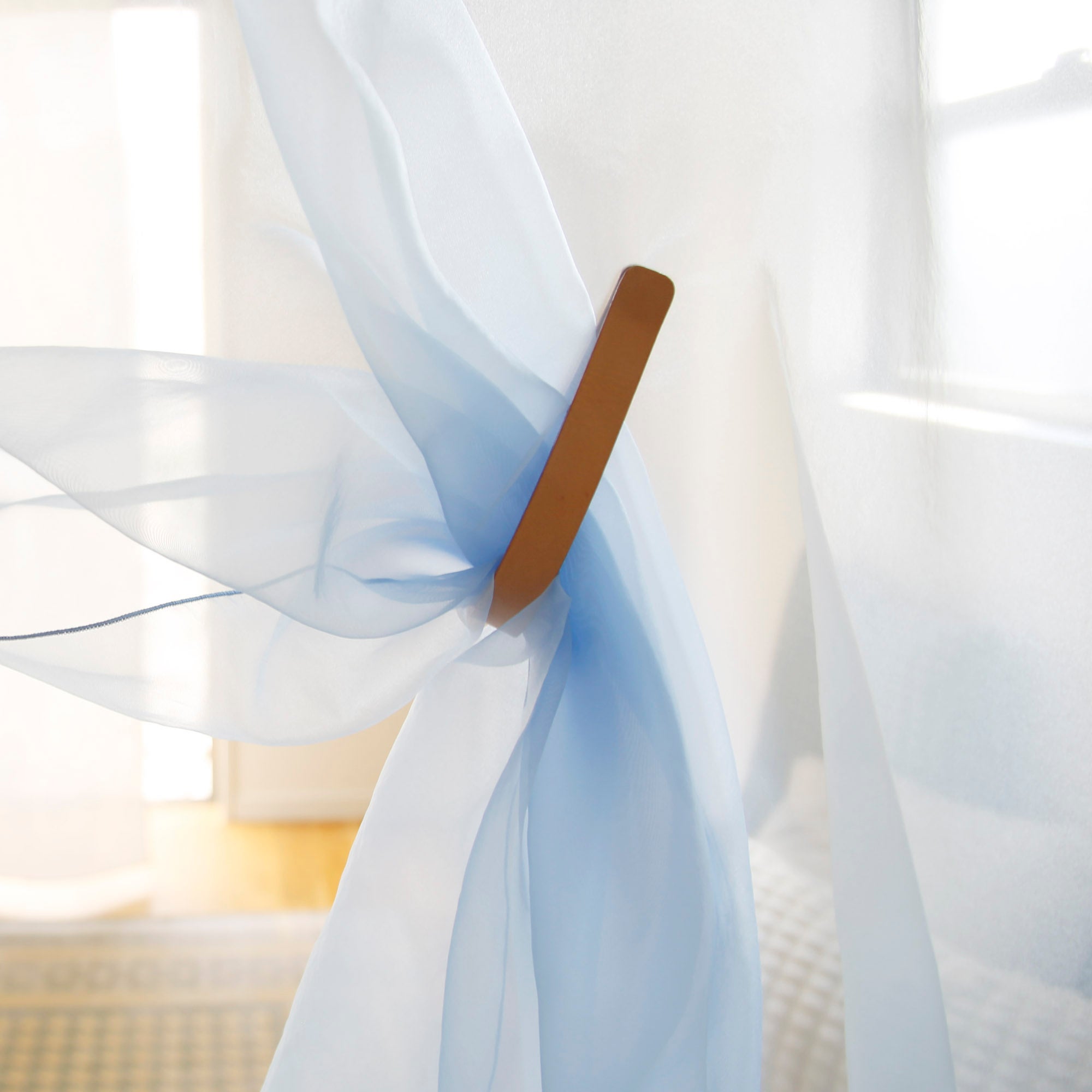 日差しの暑さやUVをしっかり避けながら、やさしい光だけを取り入れられる機能的なカーテンです。1枚でも、ボタンでつないで好きな幅に広げても使うことができます。