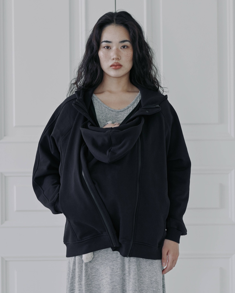 子どもを抱っこしたまま着ることができるスウェットフルジップパーカー。