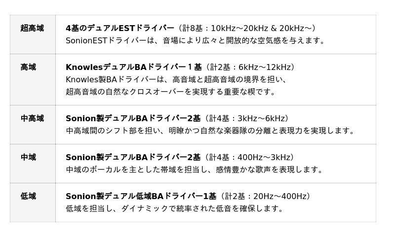 12基のBAドライバーは高域、中高域、中域、低域を緻密に周波数帯域分割を行い、ESTとBAを調和した20基のドライバーが一体となり、卓越したサウンドを奏でます。