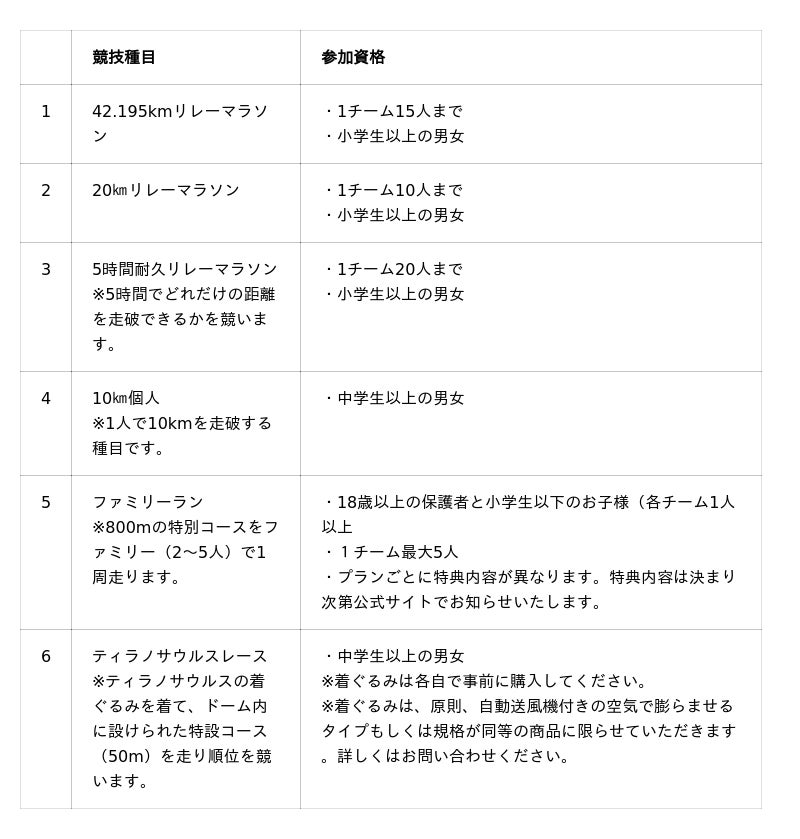 大会おなじみの1チーム最大15人で参加できる42.195kmリレーマラソンの他、大好評のティラノサウルスレース、家族みんなで参加できるファミリーランも実施!ご家族、友だち、職場仲間、そしてランナー仲間と一緒に一日中楽しみましょう!ランニング初心者さんももちろん大歓迎! 1月9日(金)からエントリー受付開始!