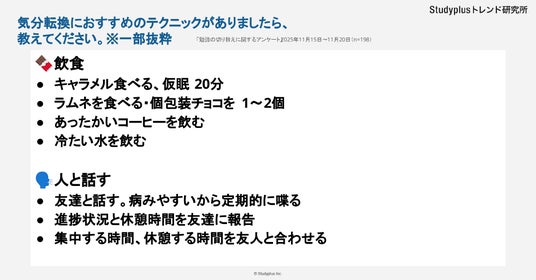 スタディプラス株式会社(本社:東京都千代田区、代表取締役:廣瀬高志、以下スタディプラス)のStudyplusトレンド研究所は、2025年11月15日(土)から11月20日(木)にかけて学習管理アプリ「Studyplus」上で全国の大学生を対象に「勉強の切り替えに関するアンケート」を実施、522名から回答を得ましたのでご報告いたします。