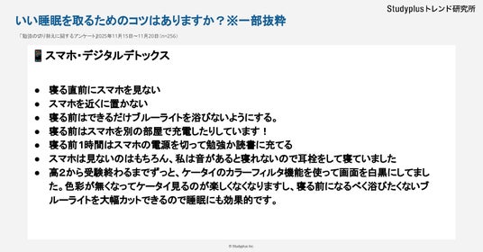 また、受験本番が近づくこの時期だからこそ関心の高まる「睡眠と休息」についても多くの声が寄せられました。「ブルーライトをカットする」や「睡眠環境を整備する」など、質の高い睡眠へのこだわりは、体調管理が合否に関わるこれからの季節に、非常に有効な情報だと感じています。