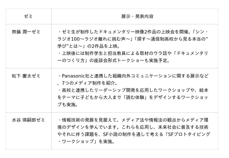 映像ジャーナリズムを学ぶ齊藤潤一ゼミ、ソーシャルデザインやコミュニケーション、リーダーシップを学ぶ松下慶太ゼミ、メディアと法の関係を研究する水谷瑛嗣郎ゼミの3ゼミが参加します。