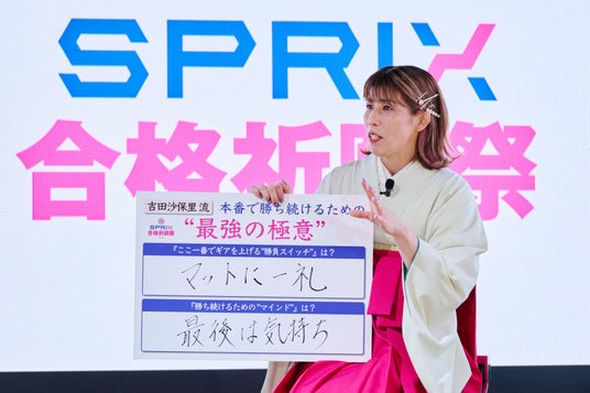 今回のイベントには、サクラピンク色の袴をまとったレスリング女子元日本代表の吉田沙保里さんが登場し、学生時代のエピソードや本番で実力を発揮するための「“吉田流”気合を入れるスイッチやマインド」についてお話しいただきました。また、最新のイマーシブビジョンを活用した「バーチャル神社」での合格祈願体験や数々の大舞台で実力を発揮されてきた先輩として入試を目前に控える受験生へ「最強の書き初め」を披露し、エールを送っていただきました。