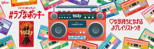 裏面がカセットテープのデザインになっている限定パッケージのポッキーを購入すると、ラジオ局J-WAVE(81.3FM)のディレクターが、6つのラブなテーマをもとに選曲したプレイリスト(全12種)を聴くことができます。曲はSpotifyで再生可能です。詳しくはキャンペーンサイトをご確認ください。