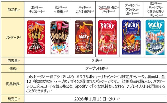 江崎グリコ株式会社は、バレンタインシーズンにむけて「メッセージと一緒にシェアしよう #ラブなポッキー」キャンペーンを、2026年1月13日(火)より開始します。本キャンペーンでは「Share happiness! 分かち合うって、いいね!」をスローガンに掲げるポッキーから、バレンタインシーズンにシェアするのにぴったりな音楽プレイリストをプレゼント。プレイリストはラジオ局J-WAVE(81.3FM)のディレクターが、6つのラブをテーマにセレクトしており、全12種類(6テーマ×邦楽セレクト・洋楽セレクトの2種類)が公開されます。カセットテープのデザインが裏面に施された限定パッケージのポッキーを購入すると、Spotifyより聴くことができます。