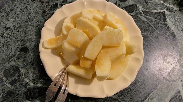 りんごとはちみつ。日本酒は「海風土」(シーフードと読みます)。