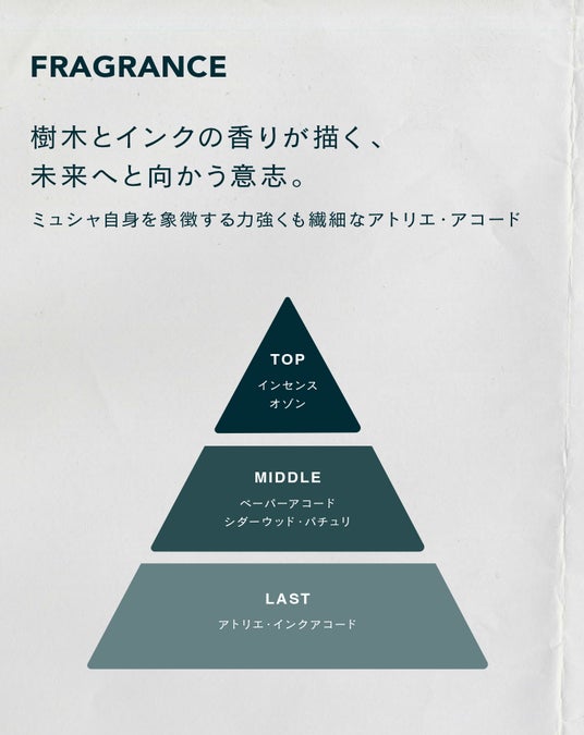 フレグランス『ミュシャ』は彼の意志と哲学からインスパイアされ、樹木とのリンクを感じさせる温かみのあるアロマティックウッディノートを基調とした香りです。