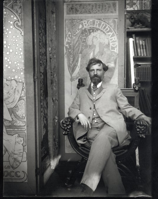 ポートレート:1901年、この年ミュシャは前年に開催されたパリ万国博覧会への貢献としてレジオン・ドヌール勲章を受章した。ジスモンダのポスターの前に座るミュシャは、威厳と力強さを兼ね備えた人物像を呈している。