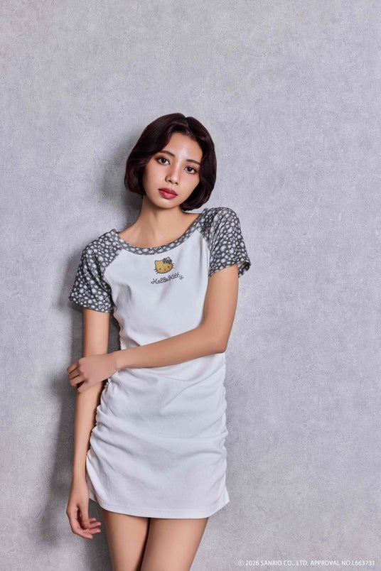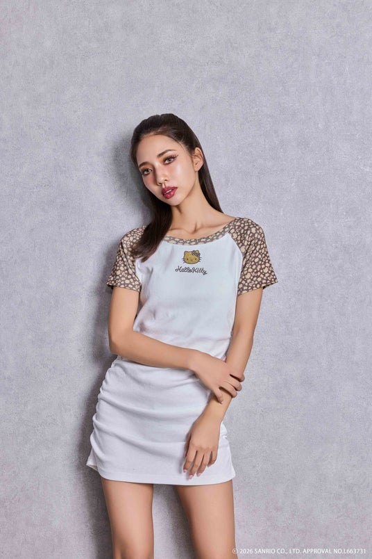 日焼けしたデザインのハローキティがキュートなグラフィックと袖のハローキティオリジナルレオパード柄が目を惹く、Tシャツとワンピースの全2型を展開します。