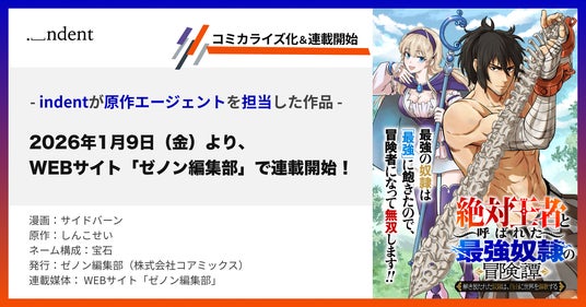 65万人を超える作家と企業をつなぐ創作プラットフォーム「Nola(ノラ)※1」を提供する株式会社indent(本社:東京都千代田区、代表取締役社長:釜形勇気 以下、「indent」)は、indentが原作エージェントを担当した『「絶対王者」と呼ばれた最強奴隷の冒険譚 解き放たれた奴隷は、自由に世界を謳歌する』(漫画:サイドバーン 原作:しんこせい ネーム構成:宝石、出版社:ゼノン編集部・株式会社コアミックス)のコミカライズ作品が、2026年1月9日(金)より株式会社コアミックスの運営するWEBサイト「ゼノン編集部」にて連載が開始されましたことをお知らせいたします。