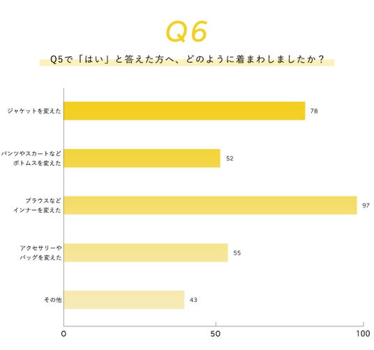卒園・卒業式と入園・入学式では同じアイテムを約7割の人が着回していることがわかりました。そこで、どのように着回しをしたか質問したところ、「ブラウスやインナーを変えた」と回答した人が最も多く、「ジャケットを変えた」と回答した人が続きました。