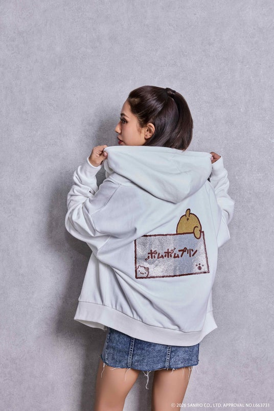 バックプリントの「ポムポムプリン」「ハンギョドン」「バッドばつ丸」がかくれんぼをしている姿がキュートなグラフィックにラメ加工を施しており、コラボならではの特別なアイテムになっています。