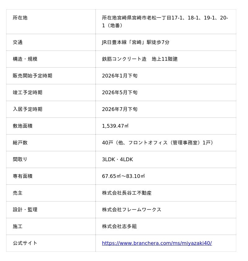 株式会社長谷工不動産(本社:東京都港区、代表取締役社長:松本 健)は、宮崎県宮崎市で2026年1月中旬より販売開始予定の新築分譲マンション「ブランシエラ宮崎」(以下、「本物件」)のレジデンスサロンを1月10日(土)にグランドオープンします。