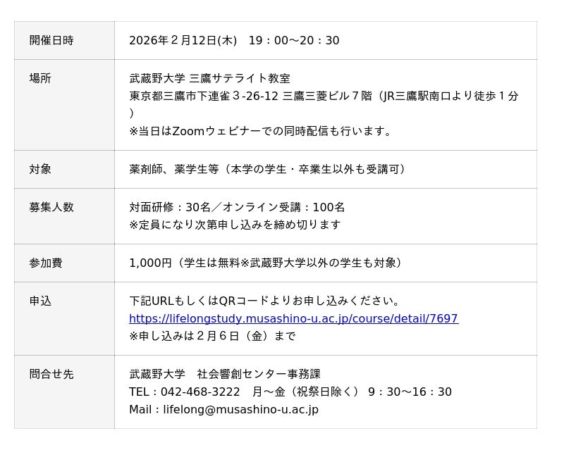 ■ 武蔵野大学生涯学習講座:https://lifelongstudy.musashino-u.ac.jp/■ 武蔵野大学薬学部薬学科: