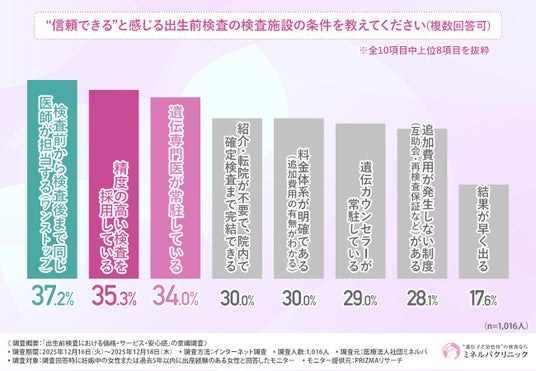 最後に、「“信頼できる”と感じる出生前検査の検査施設の条件」について尋ねたところ、『検査前から検査後まで同じ医師が担当する(ワンストップ)(37.2%)』と回答した方が最も多く、『精度の高い検査を採用している(35.3%)』『遺伝専門医が常駐している(34.0%)』となりました。