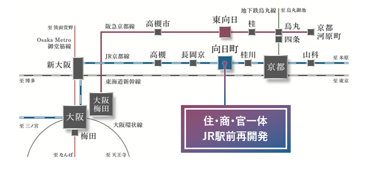 JR「京都」駅へ3駅9分、「大阪」駅へ37分と、主要都市への移動が軽快に行えます。