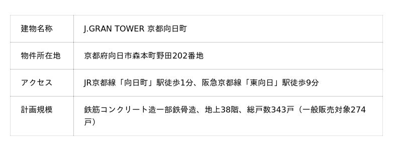 JR西日本不動産開発株式会社(本社:大阪市北区中之島二丁目2番7号、代表取締役社長:藤原 嘉人)と三井不動産レジデンシャル株式会社(本社:東京都中央区日本橋室町三丁目2番1号、代表取締役社長:嘉村 徹)は、京都府向日市のJR京都線「向日町」駅前において進行中の駅前再開発事業※2の中核として建設中の、京都府で初めてとなる地上38階建・総戸数343戸の超高層タワーレジデンス「J.GRAN TOWER 京都向日町」についてお知らせします。