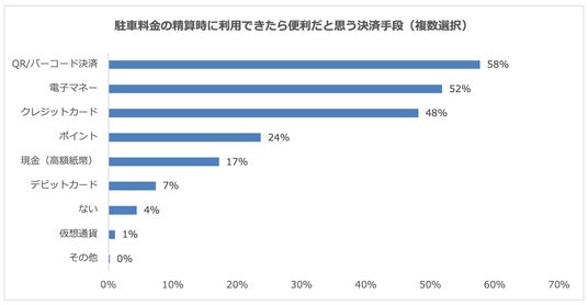 現金決済比率が高い「駐車場」で、駐車料金の精算時に利用できたら便利だと思う決済手段は、「QR/バーコード決済」が58%で最も多く、続いて「電子マネー」52%、「クレジットカード」48%となりました。